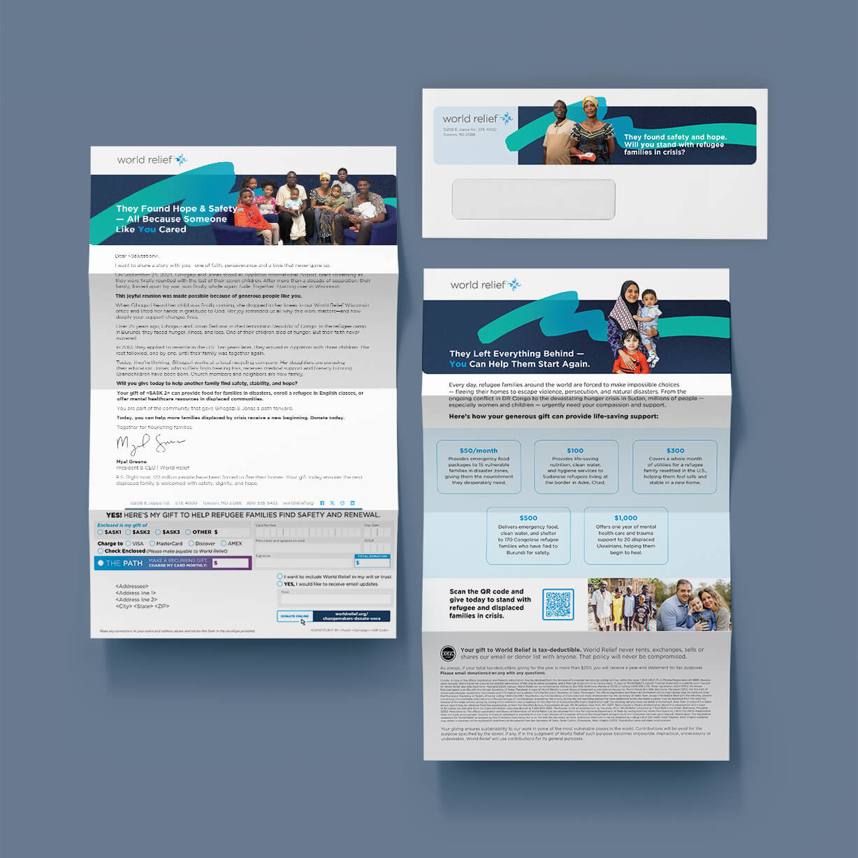 This donor solicitation direct mail piece for World Relief is thoughtfully and cleanly designed to reflect the organization’s mission of compassion, dignity, and global impact. The piece immediately conveys trust and clarity. A compelling story introduces real individuals and families facing displacement, hunger, or crisis, helping donors understand the urgent need while reinforcing World Relief’s commitment to serving the most vulnerable with care and respect.