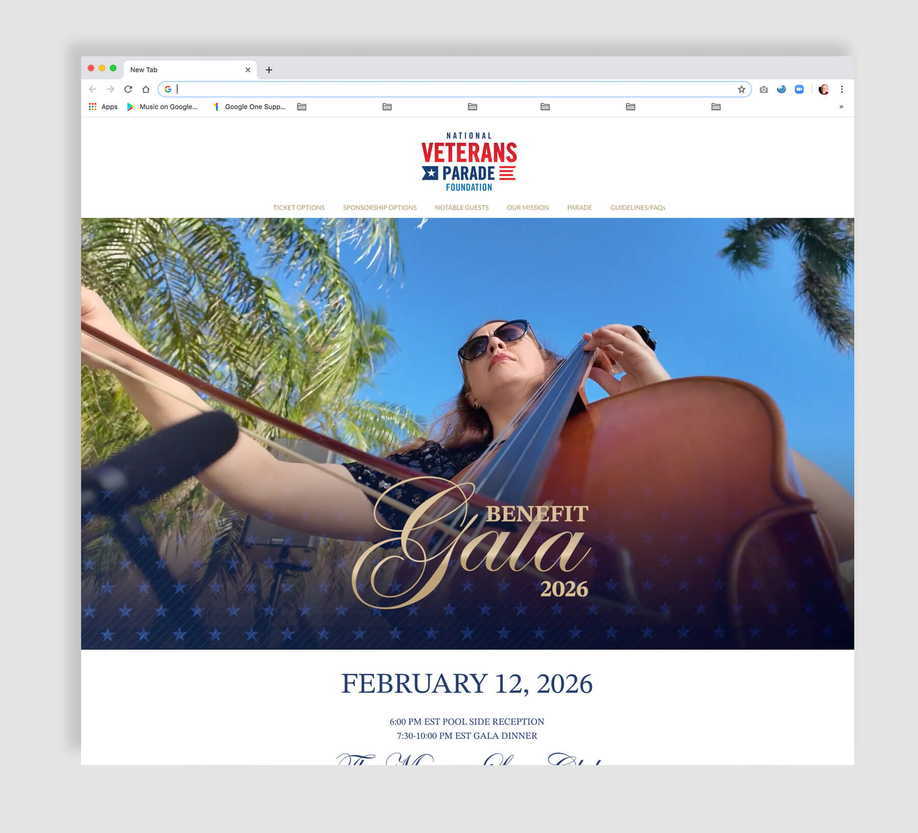 The design flows intuitively, guiding visitors from storytelling to action — whether to donate, attend, or sponsor the event. Typography choices combine a classic serif for headlines with a clean sans-serif for body copy to achieve a perfect balance of tradition and clarity.